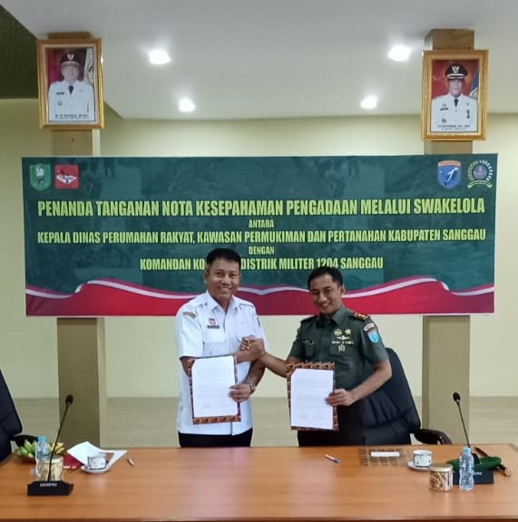 Sanggau-Pada Hari Rabu tanggal 10 Juli 2024 di Dinas Perumahan Rakyat, Kawasan Permukiman dan Pertanahan (Perkimtan) Kabupaten Sanggau, dilakukan Penandatanganan Nota Kesepahaman Pengadaan melalui Swakelola antara Kepala Dinas Perumahan Rakyat, Kawasan Permukiman dan Pertanahan (Perkimtan) Kabupaten Sanggau, Ir. Didit Richardi, MT dan Komandan Komando Distrik Militer 1204 Sanggau, Letnan Kolonel Inf. Putra Andika Trihatmoko bertempat di Aula lantai 2 Dinas Perkimtan.